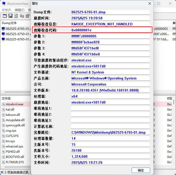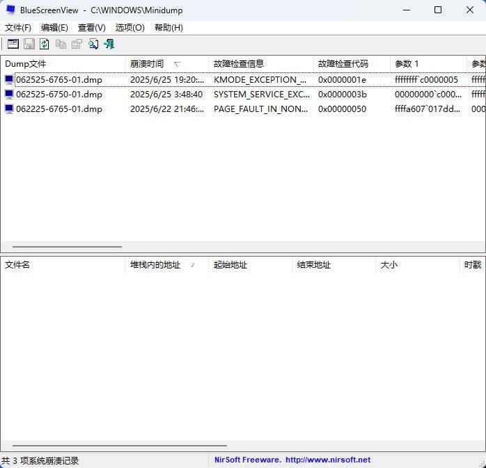 最近电脑玩着玩着总是蓝屏,重装n遍都没解决,后来找到了这个软件BlueScreenView,解决了。如何下载这个软件,可以在腾讯软件中心或者360软件中心下载,也可以在官网下载。怎么使用这个软件呢?很简单,打开软件后,一条列表就代表一次蓝屏的记录,这里显示三条列表就代表有三次蓝屏的记录,双击其中一次的记录,就打开了这一次蓝屏的属性,如图2,找到故障检查代码,红框所示,然后复制这个代码,粘贴到搜索引擎,然后就会找到相关这个代码的蓝屏原因,有时候可能不太准确,需要结合多次分析,比如我的第一次蓝屏是内存故障,但是检查内存没有故障,后来代码是驱动问题,那更新了另一个版本的显卡驱动就不蓝屏了。