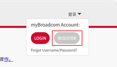 3.跳转到博通(Broadcom)的网站,在右上角点击登录-REGISTER,就可以注册啦!