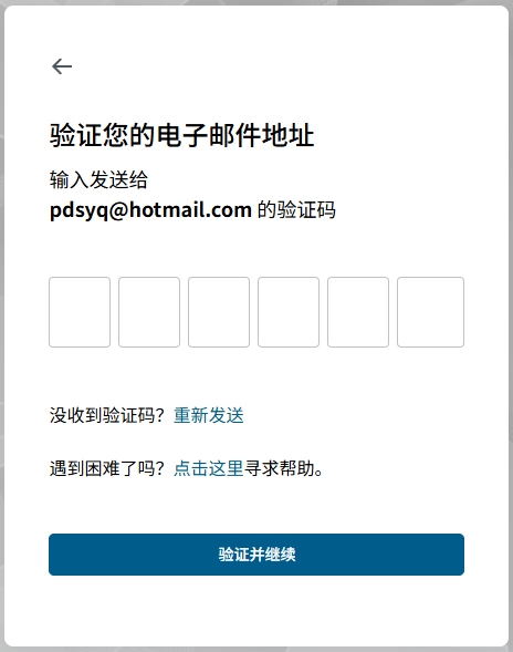 5.然后进入你的邮箱,查看验证码,并且输入上去,然后点击验证并继续。(有些邮箱接不到验证码,建议使用微软的hotmail邮箱)